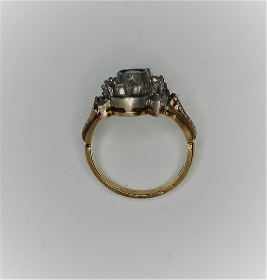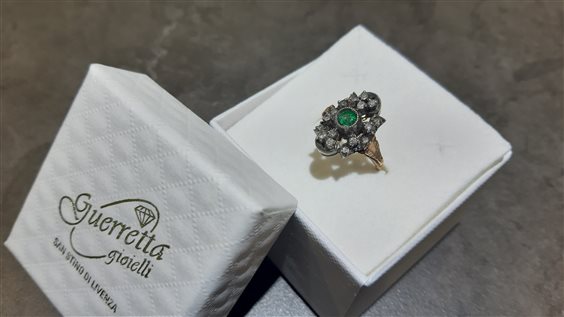 Anello artigianale in oro giallo 18Kt e argento 925, gr 6. Smeraldo centrale contornato da 16 rose di diamante, pietre incassate a griffe. Misura 17.