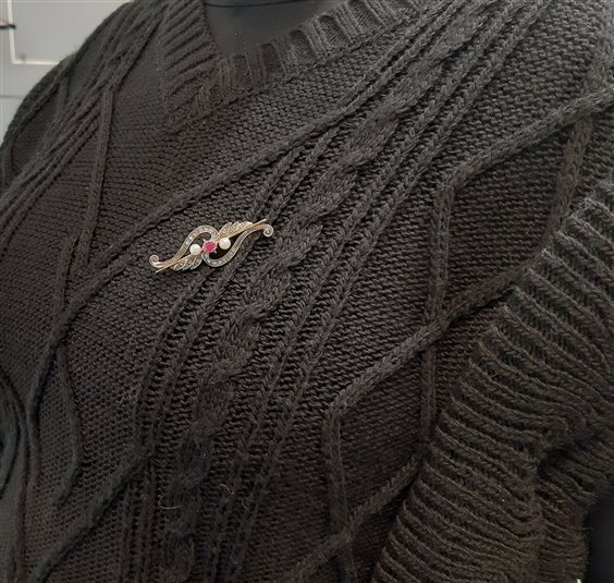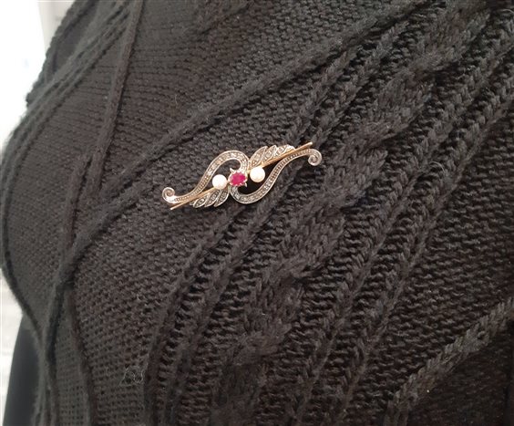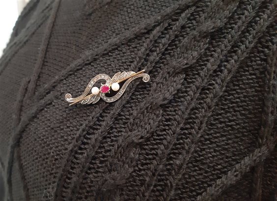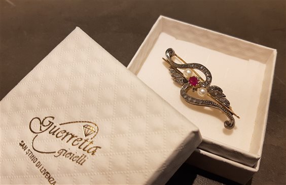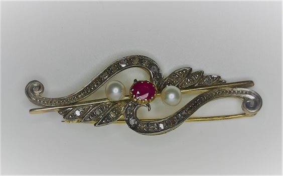 Spilla artigianale in oro giallo 18Kt e argento, gr 11,7. Rubino centrale affiancato da due perle bianche coltivate d'acqua dolce, rose di diamante incassate a griffe. Misura cm 5,5.