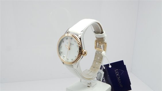 Orologio Locman Island. Cassa in acciaio mm 32, ghiera e corona (a vite) PVD oro rosa. Quadrante madreperla bianco con diamanti agli indici. Movimento solo tempo al quarzo. Fondello in titanio con viti. MADE IN ITALY