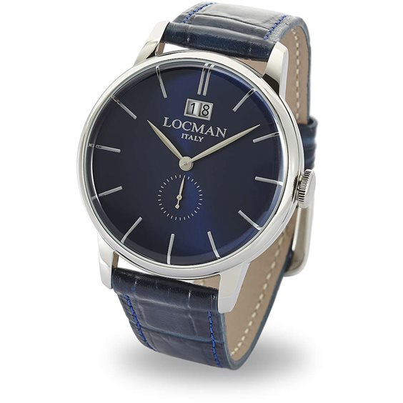 Orologio Locman 1960. Cassa in acciaio mm 40, cinturino in pelle blu stampato, chiusura ardiglione logata. Quadrante blu con indici applicati acciaio, gran data su doppia finestra al 12, secondi alle ore 6. Movimento al quarzo, vetro trattamento zaffiro. Fondello a pressione, possibilità di incisione. Impermeabilità 5 atmosfere. MADE IN ITALY IN CASO DI INCISIONE NON SARA' POSSIBILE IL RESO