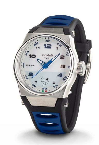 Orologio Locman Mare. Cassa mm 40 in acciaio satinato, cinturino in silicone nero e blu con fibbia. Quadrante bianco e azzurro con indici blu stampati, datario al 3. Movimento al quarzo, vetro trattamento zaffiro. Fondello con viti, corona a vite. Possibilità di piccola incisione. Impermeabilità 10 atmosfere. MADE IN ITALY IN CASO DI INCISIONE NON SARA' POSSIBILE IL RESO.