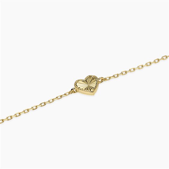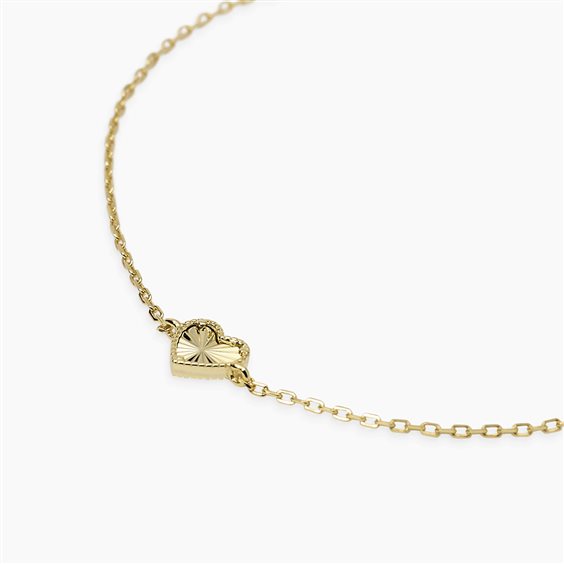 Bracciale in argento 925 dorato. Catena maglia forzatina con cuore centrale mm 0,5. Misura regolabile da cm 16 a cm 19. Chiusura a moschettone.