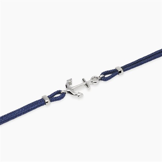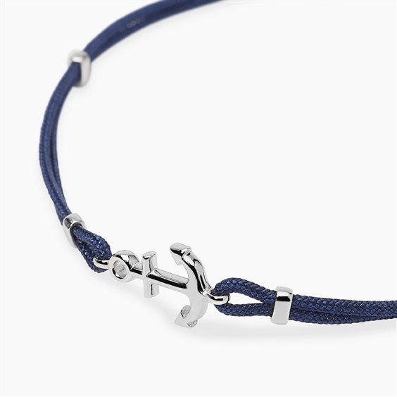 Bracciale in cordoncino blu e argento 925. "Ancora" centrale cm 1,5. Chiusura a moschettone. Misura regolabile da cm 18,5 a cm 20,5.