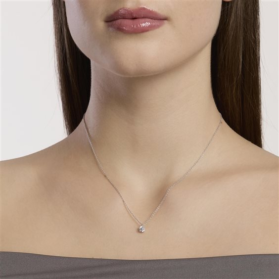 Girocollo punto luce in argento 925 e diamante lab-grown. Catena maglia rolò, punto luce a griffe con 1 diamante lab grown, carati 0,25, colore F, purezza VS. Misura regolabile da cm 39 a cm 43.