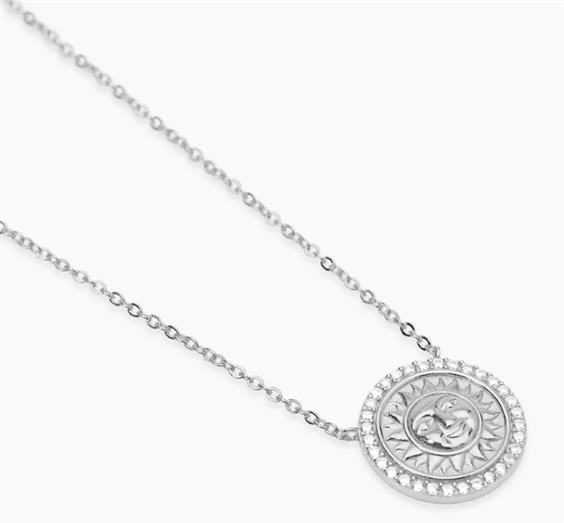 Girocollo in argento 925 rodiato e zirconi bianchi. Catena maglia rolò, medaglia centrale con contorno di zirconi bianchi e sole in rilievo. Misura regolabile da cm 40 a cm 45.
