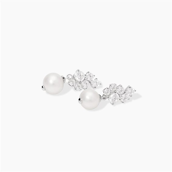Orecchini pendenti in argento 925, zirconi e perle. Per orecchino: 6 zirconi bianchi di dimensioni differenti tra loro e 1 pera coltivata mm 6-6,5. Misura cm 1,8.