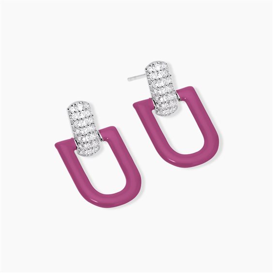 Orecchini pendenti in argento 925, zirconi e ottone smaltato fucsia. Pendente cm 2,5.