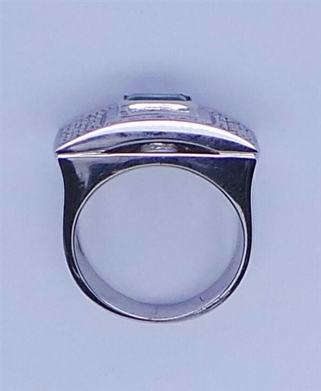 Anello in oro bianco 18Kt rodiato, gr 14,1. Fascia con smeraldo taglio smeraldo centrale, carati 1,15. 46 diamanti taglio brillante incassati a pavè, carati totali 0,54, colore G, purezza VS. Misura 14. MADE IN ITALY