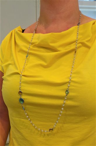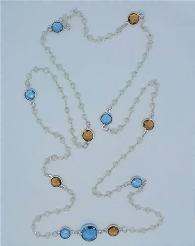 Collana lunga in argento 925 rodiato e pietre dure. Cristallo di rocca sfaccettato, quarzo idrotermale sfaccettato azzurro e fumè. Misura cm 100.