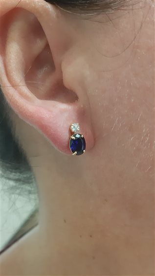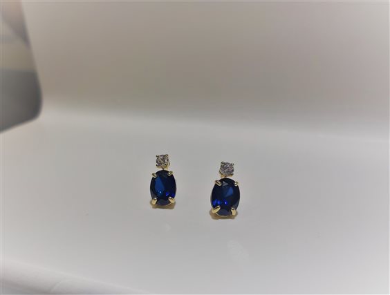 Orecchini a lobo in oro giallo 18Kt, gr 2,6. Due zirconi blu ovali con due zirconi bianchi incassati a griffe.
