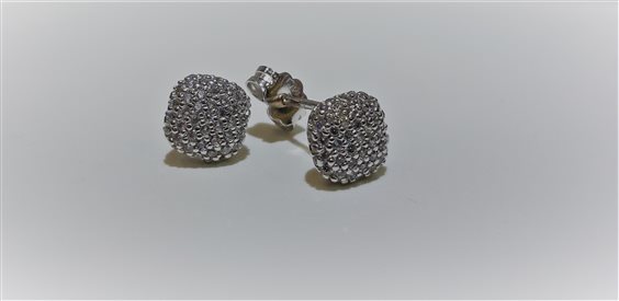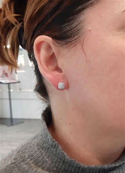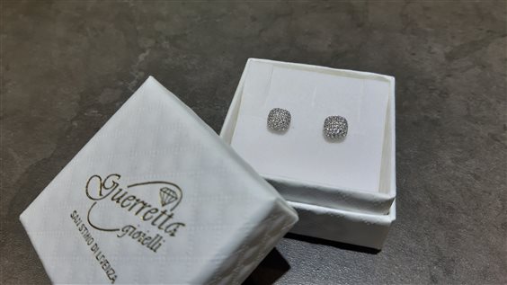 Orecchini a lobo in oro bianco 18Kt, gr 2,5, rodiato. Forma quadrata, zirconi bianchi incassati a pavè.