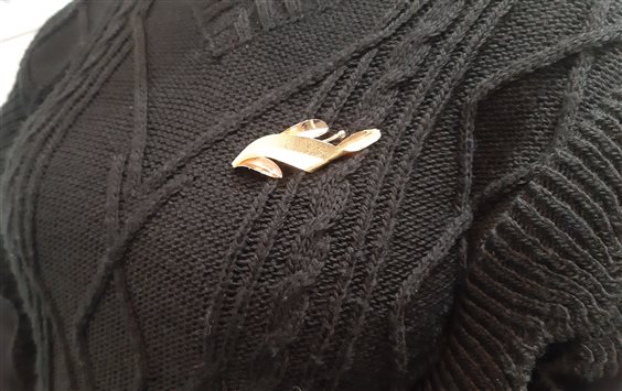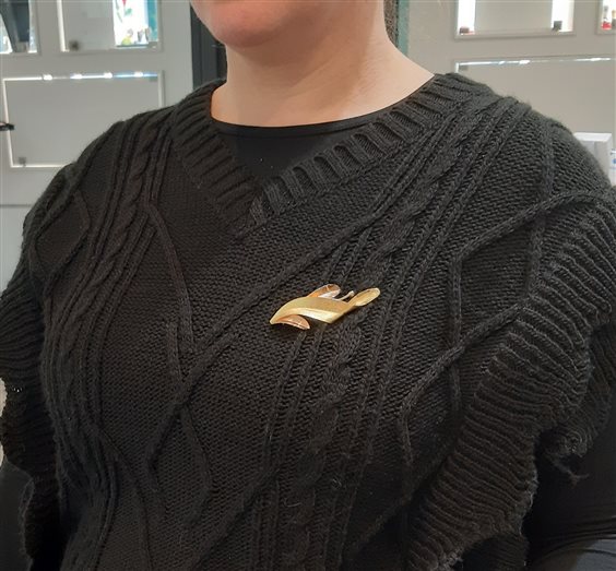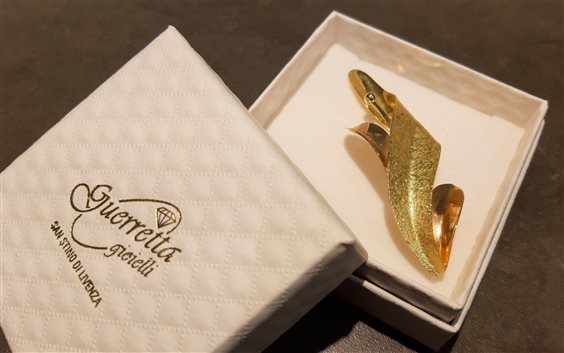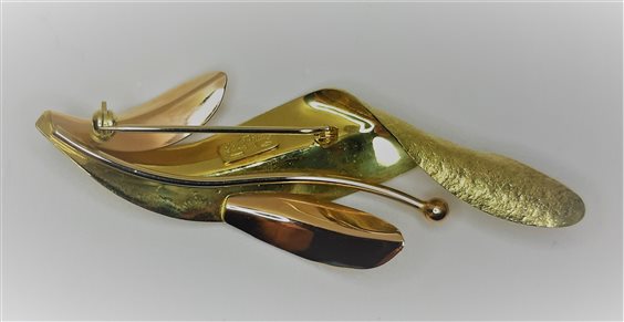 Spilla artigianale in oro giallo 18Kt, gr 10,4, lucido e satinato. Misura cm 7.